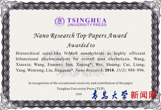 新闻网讯 我校材料科学与工程学院刘敬权教授团队发表在Nano Research的研究成果获2020年“Top Papers Award”的殊荣(每年该奖只有10项左右)。该团队在电解尿素水溶液领域以“Hierarchical coral-likeNiMoS nanohybrids as highly efficient bifunctional electrocatalysts for overall urea electrolysis (Nano Res. 2018(2): 988-996,影响因子8.183,被引用46次)”为题发表的文章引起了同行的广泛关注与认可,该文章第一作者为材料学院王晓霞老师,通讯作者为材料学院刘敬权教授和四川大学孙旭平教授。