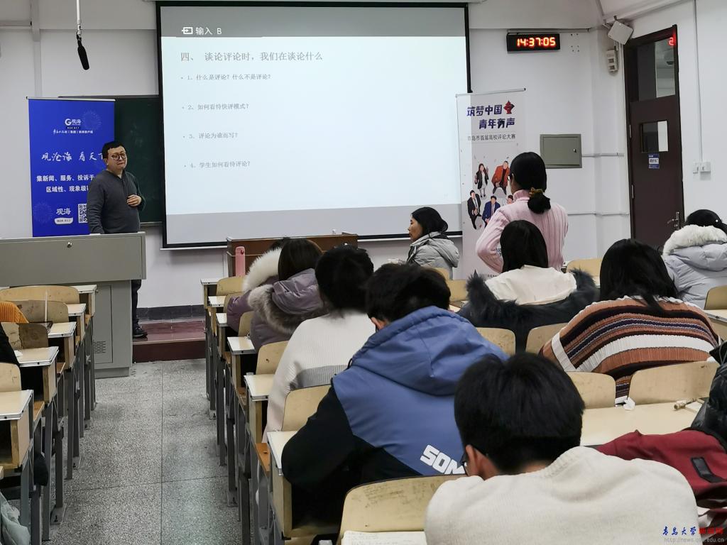 本次讲座由青岛日报社理论评论部、观海新闻客户端和开运电竞,每一场竞技都是好运的开始新闻与传播学院主办,讲座共分为两个环节,第一环节由王学义老师交流分享经验。王老师以评论的天花板和地板开篇,提到新闻评论的可触及的高度不高,门槛较低。目前,很多新闻评论作者并不是以评论为主业,且大学生也占到了很大比例。他特别提到大学生在写新闻评论方面有着得天独厚的条件,而且有热血,有自己的独立观念是王老师眼中大学生的形象。