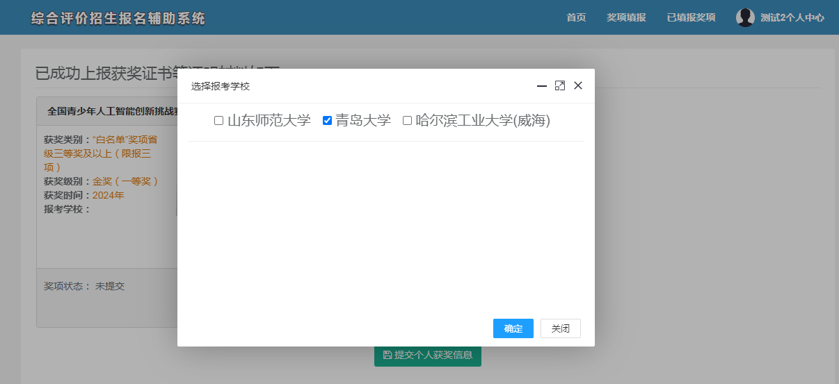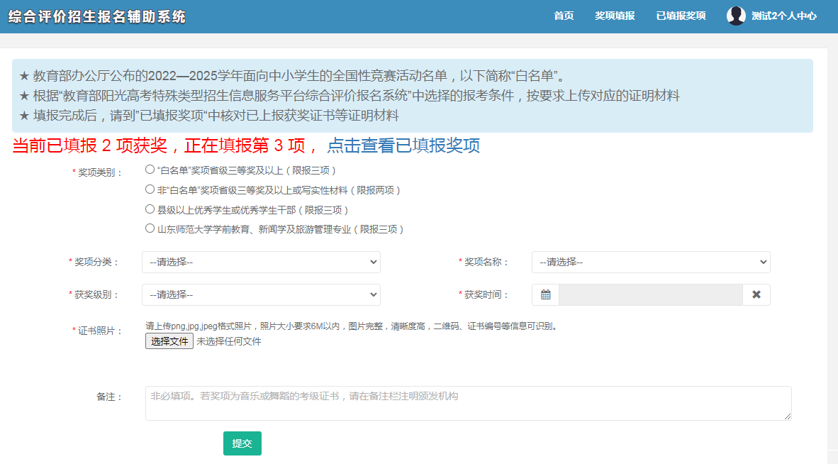 考生所有上报获奖证书等证明材料,均以“已填报奖项”中显示的提交成功的获奖为准。
