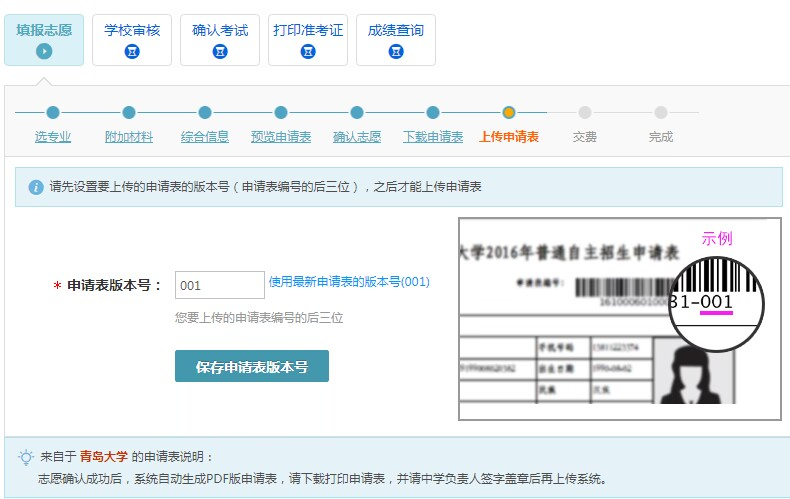 点击“确认志愿”后,确认志愿成功,点击“下载申请表”,然后点击“下一步”,输入申请表的版本号“001”进行保存