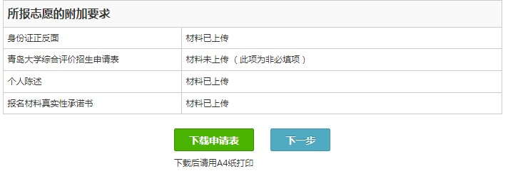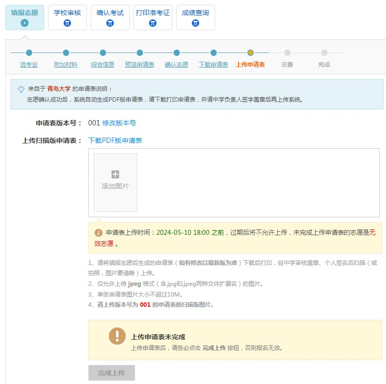申请表下载后进行打印并个人签名,到所在中学审核并签字盖章、拍照上传。申请表盖章上传后,点击“完成上传”,上传成功后,请进行交费,交费成功后等待我校审核