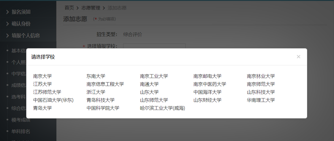 注册成功后,请使用注册的用户名和密码登录“综合评价报名系统”,请仔细阅读“报名须知”,只填写基本信息、个人照片、中学信息、成绩信息(只填一科成绩即可)、选考科目成绩信息等系统必填项即可。