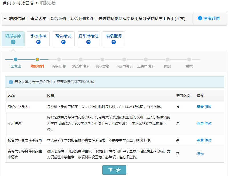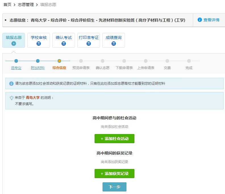 在“综合信息中”不需要添加信息,直接点击“下一步”,获奖材料请在综合评价招生报名辅助系统上传,请见第五部分说明。