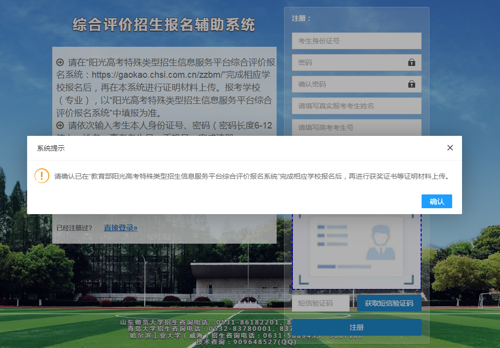 (一)系统网址:http://sdyk.oumacloud.cn:85,打开网址后点击“注册”,注册前请确认已在教育部阳光高考特殊类型招生信息服务平台综合评价报名系统完成报名,点击“确认”。