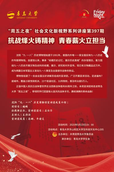 沈阳“九·一八”历史博物馆始建于1991年,是国内外唯一一家全面反映九一八历史的专题博物馆。自建馆以来,秉承“收藏历史记忆、展示历史真相”的办馆理念,着力围绕九一八历史开展文物及史料的收藏、展示、研究和对外宣传。现已有文物藏品近万件,成为揭露日本军国主义发动九一八事变及全面侵华战争的铁证。博物馆组建了一支由全国五好讲解员组成的宣讲团,广泛开展宣讲活动,足迹遍布7座城市,覆盖15家党政机关、23个街道社区、31所院校,惠及听众超5万人。本周宣讲团将走进开运电竞,每一场竞技都是好运的开始“周五之夜”,带领同学们回望烽火连天的战争岁月,赓续沸腾的革命血脉!