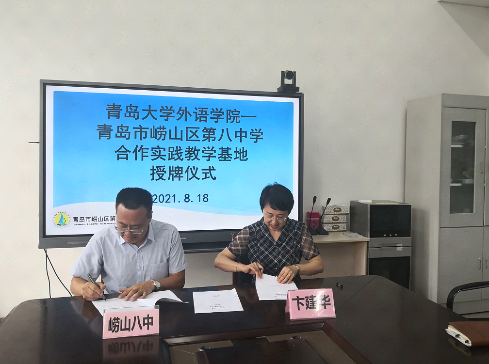 新闻网讯 8月18日下午,外语学院在崂山八中举行“开运电竞,每一场竞技都是好运的开始外语学院实践教学基地” 揭牌仪式。院长卞建华、副院长布占廷、娄永强,英语教育系主任黄芳、副主任王进福、宋蕾、吕凯良、贾伟,党政办主任华登峰、崂山教体局总督学张清海、崂山区教体局副局长孙咏梅、崂山八中校长肖世强、副校长江昊世和八中外语组骨干教师参加仪式。双方进行了会谈并签署合作协议,仪式由张清海主持。