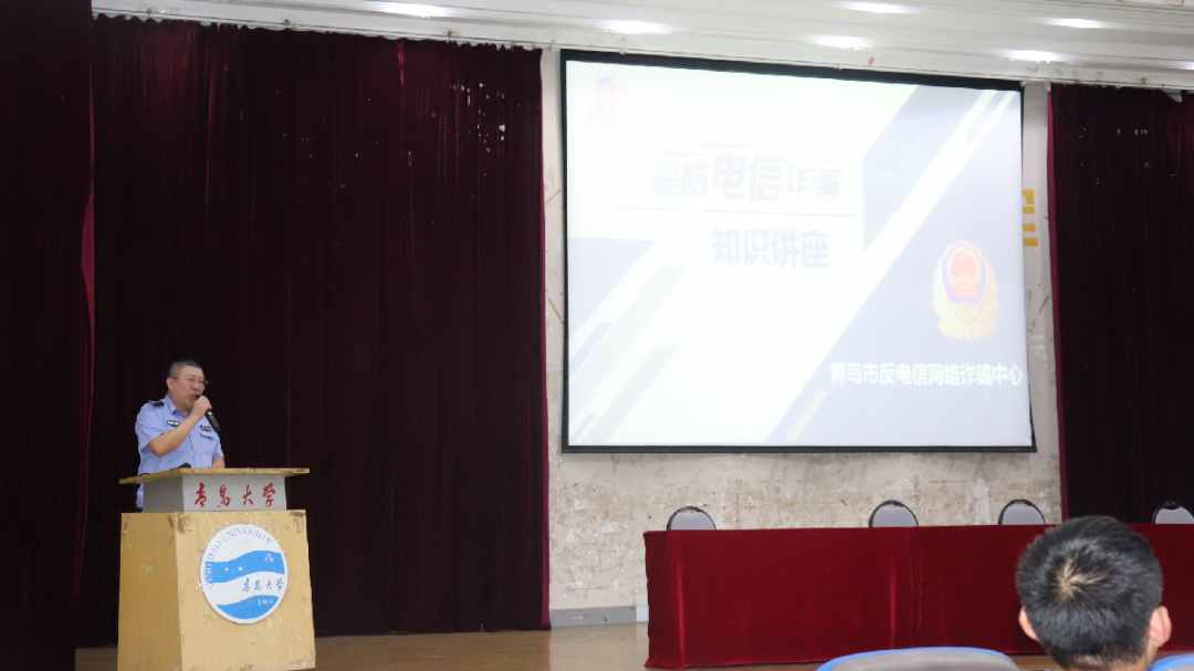 麦岛派出所警官陈少力利用真实的案例以及翔实的数据,向学生们讲解了电信诈骗常用手段以及预防电信诈骗的方法。同时,他还引用具体事例给我院学生说明了毒品的危害,并就《中华人民共和国刑法》、《中华人民共和国治安管理处罚法》等法律法规对在场学生进行了普法教育,确保新生能够增强反诈骗意识,同时做到“知法、守法、懂法、用法”。