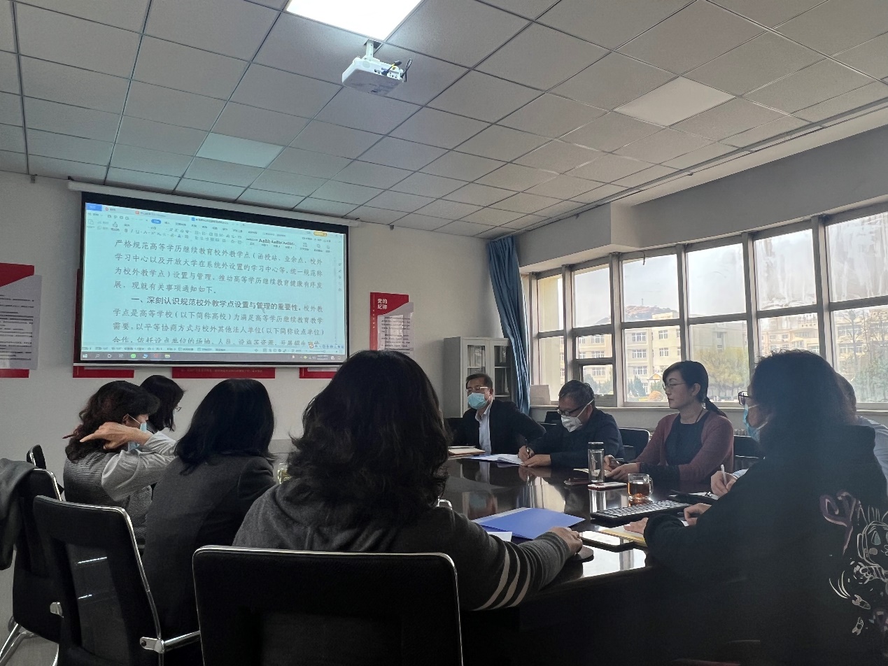 新闻网讯 4月21日下午,应用技术学院党委在行正楼310会议室召开理论学习中心组(扩大)会议,专题学习教育部办公厅《关于严格规范高等学历继续教育校外教学点设置与管理工作的通知》精神。学院党委书记宋佐东主持会议并讲话,学院党委副书记、院长耿宝福,理论学习中心组其他成员、党支部书记及相关科室负责人参加。