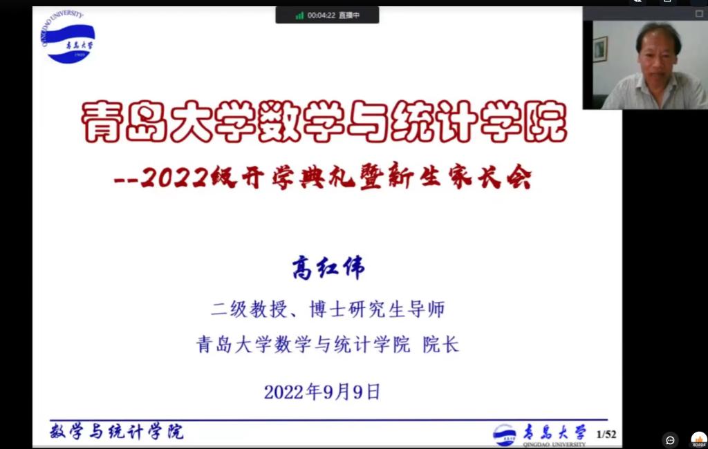 迈进青大,共筑未来——2022级本科开学典礼暨新生家长会。9月9日晚,学院举办线上2022级开学典礼暨新生家长会。院长高红伟强调了目前国家对于数学等基础学科的重视并着重从数学学科现状、学科发展和学院概况三方面全面对学院的院系建设展开介绍。随后,魏小平并从确立目标、如何度过大学等几个方面为新生做开学第一课。会议点赞高达八万余次,新生与家长热情高涨。
