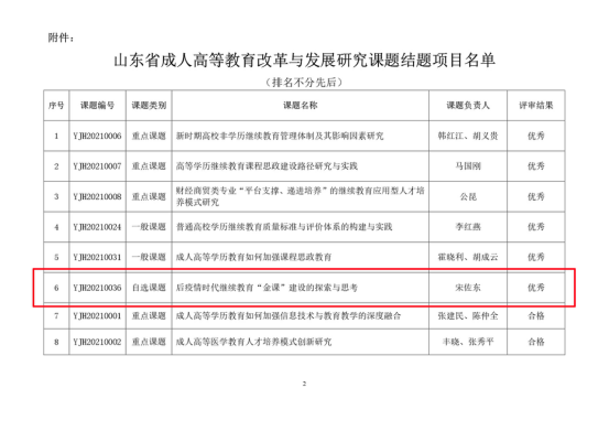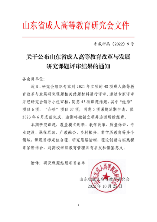 新闻网讯 近日,由山东省成人高等教育研究会组织开展的“2021年度山东省成人高等教育改革与发展研究课题评审活动”结果揭晓,我校继续教育学院承担的研究课题《后疫情时代继续教育“金课”建设的探索与思考》顺利通过结项评审,研究成果获评“优秀”。