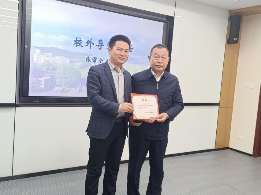天泰集团为获得2023年“天泰奖学金”的同学颁发奖金和证书。颁发仪式后,刘善东为校外物业总经理张常全颁发导师聘书。