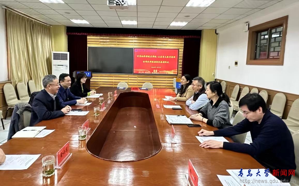 潘秋鸿对山东青大教育集团一行的到来表示热烈欢迎,衷心感谢教育集团在基础教育方面的拓展和尝试,表示学院将发挥学科优势,全力助推山东青大教育集团附属学校人工智能素质教育。郭振波在致辞中表示山东青大教育集团发展成效显著,是青大服务地方的一个亮点,为学校的人才队伍建设和青年教师发展提供了坚强的保障,同时期待双方在社会服务、教育培训等领域进一步深化合作。张贞齐介绍了教育集团的基本情况、组织架构、合作办学愿景和使命以及目前所取得的发展成效等。他表示,集团将与计算机科学技术学院共同组建课程团队,打造人工智能特色课程体系,构建富含青大元素的基础教育特色学科。