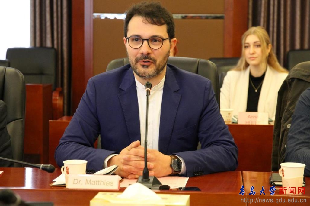 研学团领队格堡博士(Dr. Matthias GEBAUER)介绍了德方研学团概况,对卞院长及綦主任的热情致辞及外语学院的热情接待表示诚挚感谢,并表示愿意在项目研究中发挥一定作用。