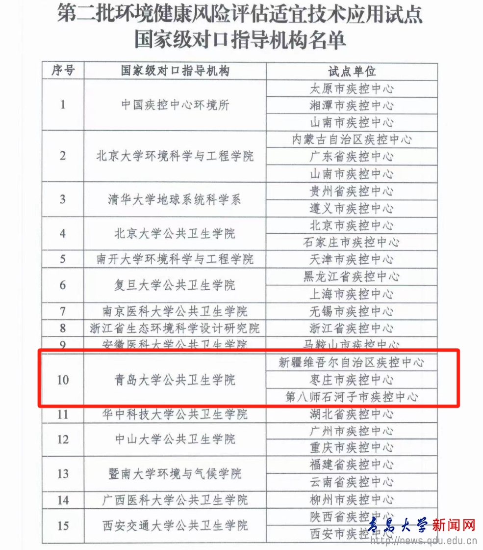 新闻网讯 近日,国家疾控局卫生免疫司在北京组织召开全国第二批环境健康风险评估适宜技术应用试点工作启动会暨技术培训班,我校公共卫生学院成功入选“第二批环境健康风险评估适宜技术应用试点——国家级对口指导机构”,指导新疆维吾尔自治区疾控中心、第八师石河子市疾控中心以及枣庄市疾控中心开展相关工作。