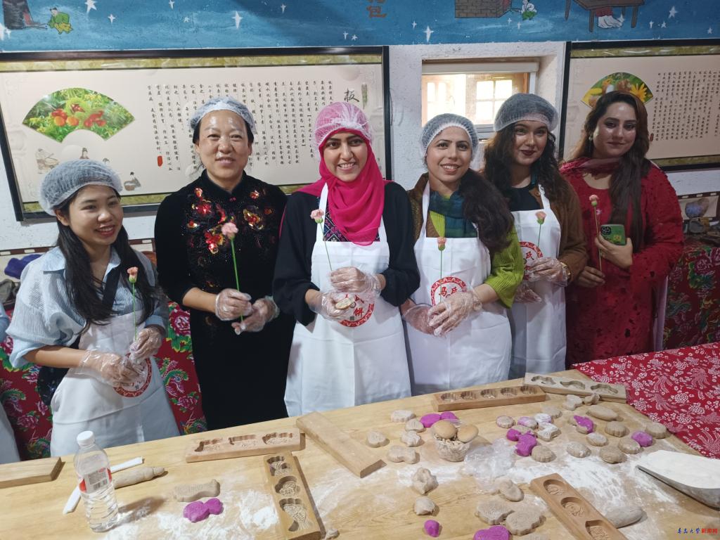 留学生们首先来到了“山东省美丽宜居村庄”“山东省乡村文明家园建设示范村”“山东省生态文明村”“青岛市社会主义新农村建设示范村”—莱西市水集街道产芝村,在莱西市马氏巧饼第七代传承人马秀娥的指导下,在七巧工坊学习了非遗七巧饼的制作方法。
