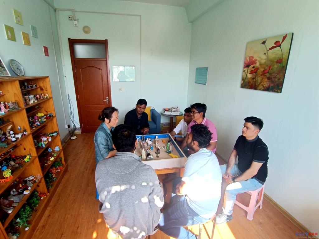 在团体活动室,美术老师以讲座和互动体验的形式为留学生上一堂别开生面的团扇绘制课。在老师的悉心指导下,留学生们陆续绘制完成了自己扇面作品。在沙盘游戏室,心理中心老师向留学生们介绍了不同类型的沙盘模具,并强调沙盘游戏采用的心理映射技术是目前国际上非常流行的心理治疗方法,借助不同的沙具将心中的图画构建在沙盘上,以此来表达自己的内心世界。留学生们纷纷尝试着摆放模型,动手体验。