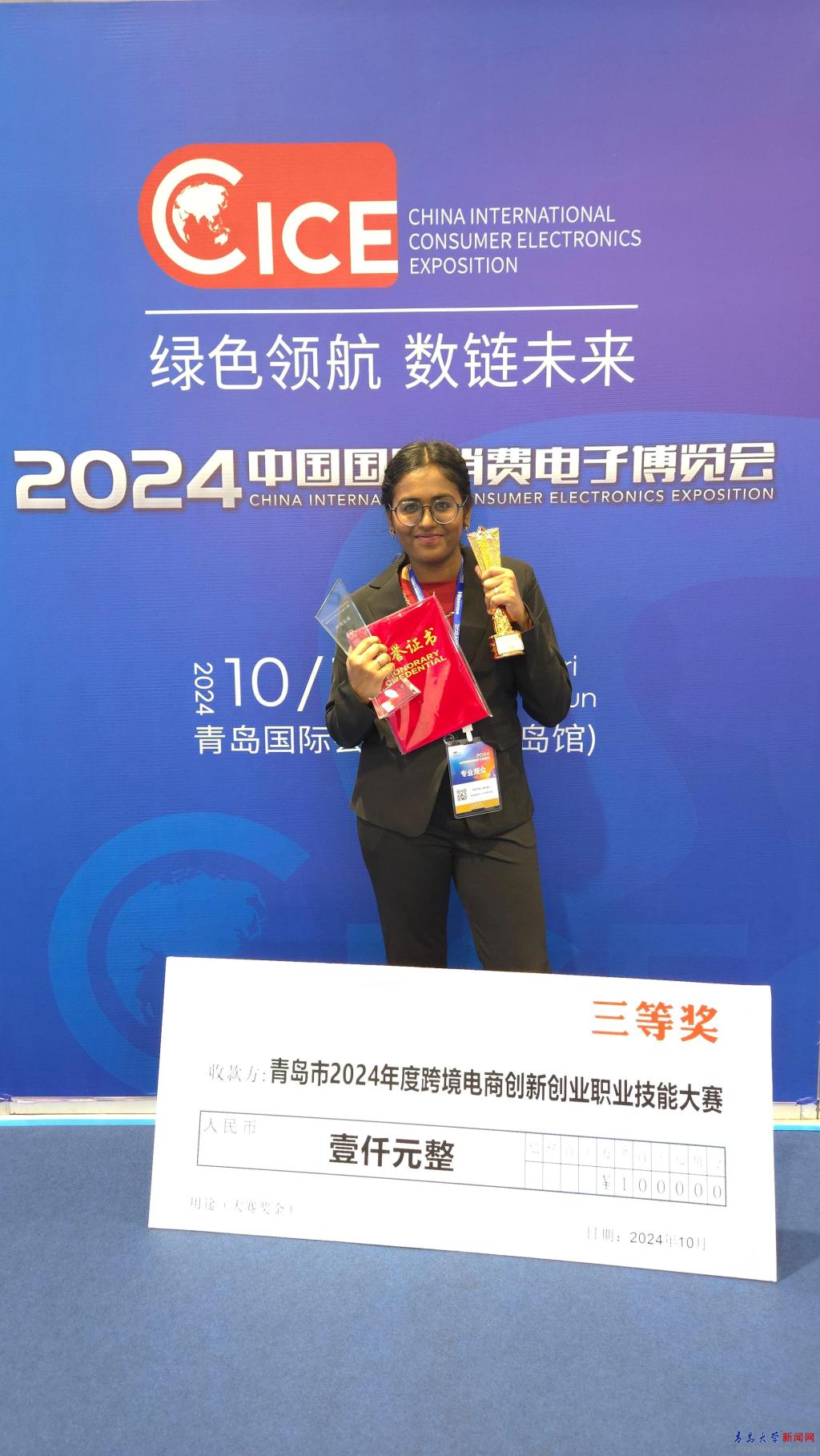 同日,由青岛市商务局、青岛市总工会、共青团青岛市委、青岛市工商业联合会、青岛市教育局、青岛市人力资源和社会保障局、上合示范区管委会主办,由青岛市贸易发展服务中心、青岛市进出口企业商会承办的青岛市2024年度跨境电商创新创业职业技能大赛决赛在青岛国际会展中心(红岛馆)举办,我校医学部留学生贝塔所在“菁彩青岛”团队荣获TikTok短视频营销赛道三等奖,指导教师韩东荣获优秀指导教师奖。