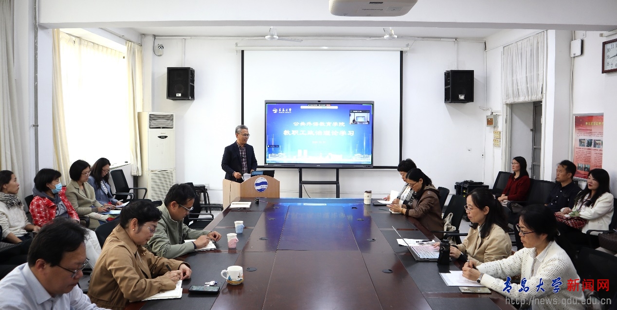新闻网讯 10月24日,公共外语教育学院在睿思楼202会议室召开全体教职工政治理论学习会暨大学英语活动月教师研修分享会。校党委第二巡察组副组长孙鹏、成员沈香韫莅临督导,学院班子成员及全体教师参会。学院党委副书记、院长国林祥主持会议。