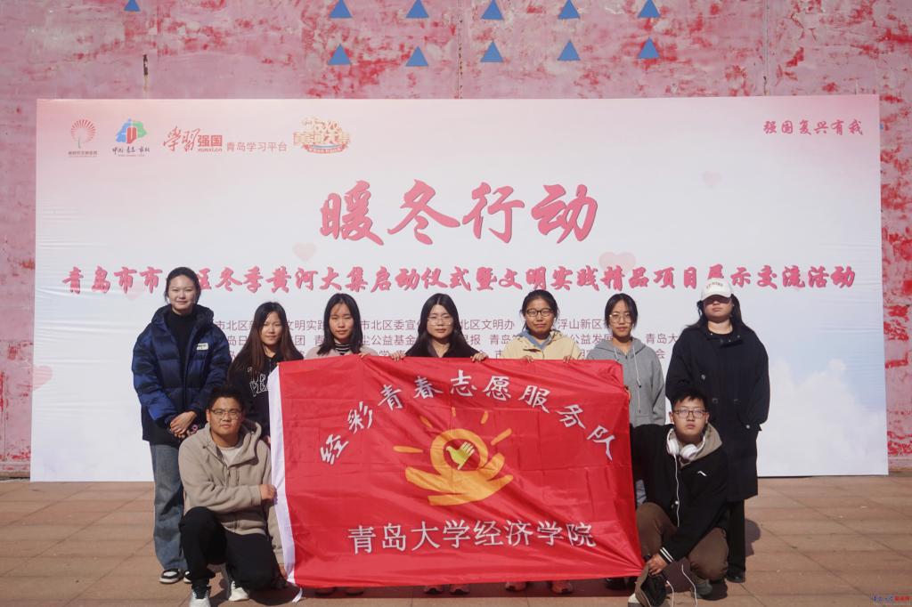 新闻网讯 11月23日,时值寒冬,位于浮山后新区的青岛市市北区新时代文明实践广场却是暖意融融。2024年“暖冬行动”暨市北区冬季黄河大集启动仪式拉开帷幕。爱心白菜进社区、冬衣捐赠、健康义诊、便民服务、文明风尚宣传……热心市民与志愿者们凝心聚力、爱心接力、温暖传递,让这个冬季不再寒冷。活动由市北区新时代文明实践中心、市北区委宣传部、市北区文明办等单位主办,青岛市微尘公益基金会、青岛笑姐志愿者公益发展中心、我校经济学院等单位协办。经济学院经彩青春服务队志愿者参与活动志愿服务,辅导员周晓彤主持启动仪式。