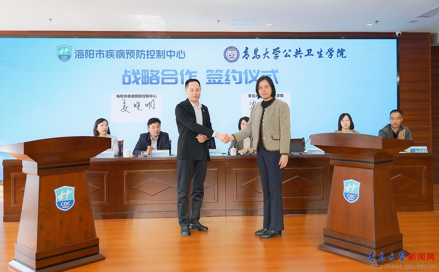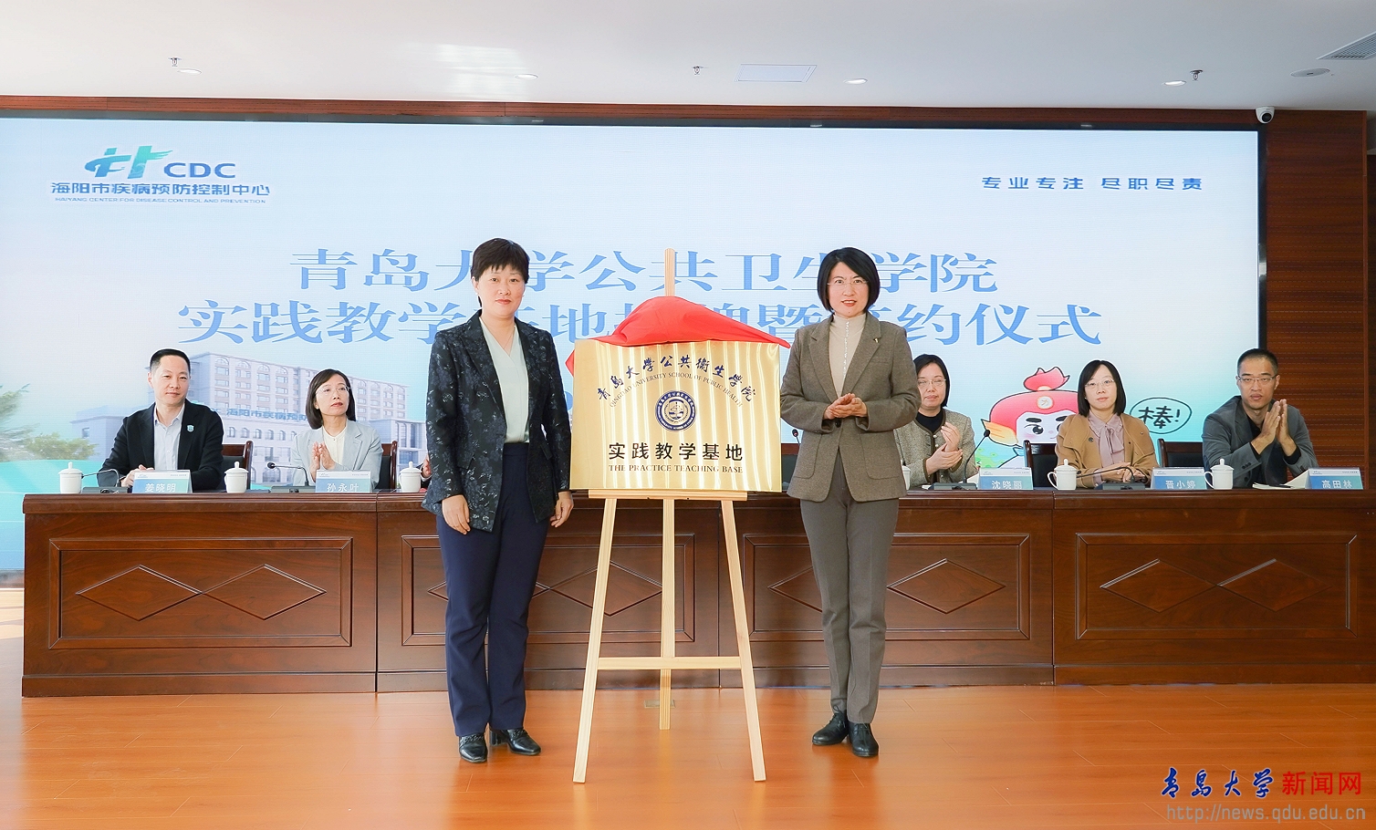 新闻网讯 近日,公共卫生学院与海阳市疾病预防控制中心共建实践教学基地签约揭牌仪式在海阳市疾病预防控制中心顺利举行。海阳市委常委、统战部部长、副市长倪永妮,海阳市卫健局党组书记、局长马占胜,海阳市疾控中心党支部书记、主任姜晓明;公共卫生学院党委书记贾依娜、副院长沈晓丽;以及海阳市疾病预防控制中心相关科室负责人,公共卫生学院系主任、青年骨干教师、学生代表等共同参加签约揭牌仪式。签约揭牌仪式由马占胜主持。