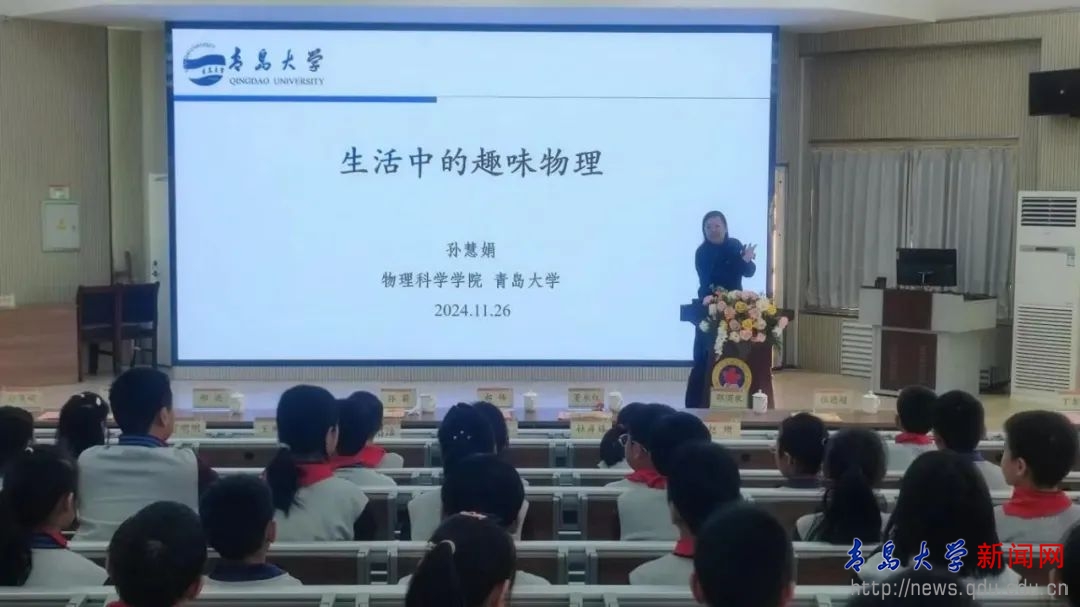 启动仪式结束后,物理科学学院应用物理系党支部书记孙慧娟博士为青岛嘉峪关学校教育集团学校的学生作《生活中的趣味物理》的科普报告,受到同学们的热烈欢迎。