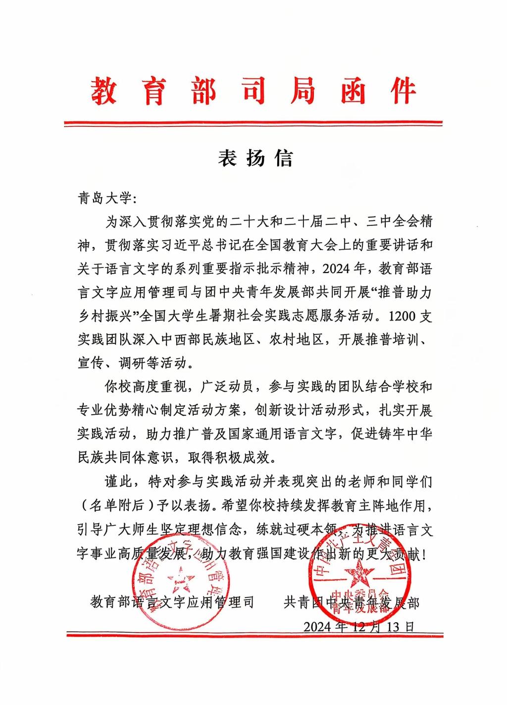 新闻网讯 近日,由教育部语言文字应用管理司、共青团中央青年发展部联合开展的2024年“推普助力乡村振兴”全国大学生暑期社会实践志愿服务活动评选结果揭晓,开运电竞,每一场竞技都是好运的开始艺术学院“美润昆仑”2024新疆乡村美育振兴民族团结实践团从全国1200支团队中脱颖而出,获评优秀团队,教育部语言文字应用管理司和共青团中央青年发展部来信表扬。
