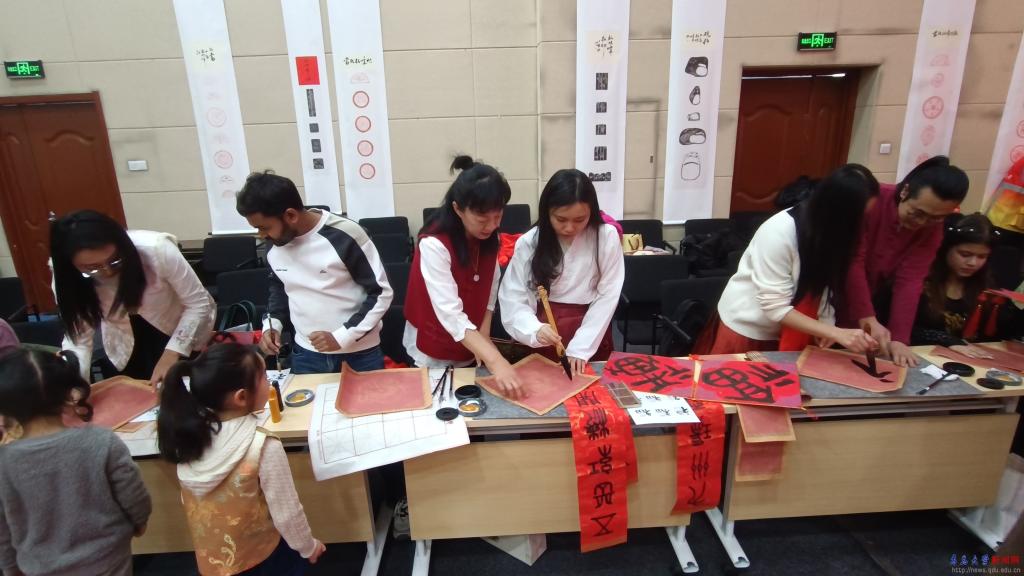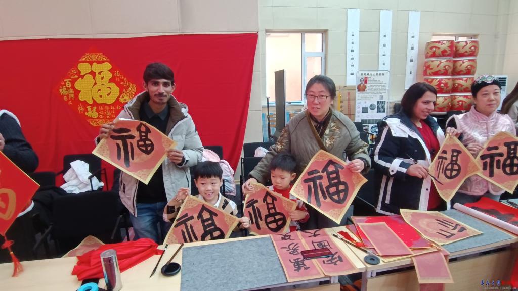 新闻网讯 1月10日,我校30余名外国留学生及国际教育学院汉语国际教育专业的硕士研究生共同参加了在沙子口街道文明实践所举办的“我们的节日春节”暨“福满四海”同庆“非遗”里的中国春节活动,我校中外学生代表、沙子口街道辖区居民及小学生代表、崂山区青年书法家等积极参与其中,共同奏响了一曲中外共融的春节文化交响曲。