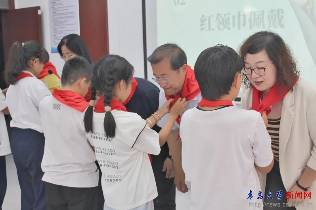 活动伊始,天山小学的学生代表为与会老师们佩戴红领巾,现场气氛热烈而温馨。在时代故事分享环节,退休教师许敏、顾晓梅回忆童年故事,并结合自身经历,讲述奋斗岁月中的坚守与热爱。风采展示环节,离退休老教师朗诵协会以一首《我和祖国一起飞》的激昂诵读,展现家国情怀;天山小学学生用民族特色画作,勾勒出五彩斑斓的童真世界;外语学院iStep梦想合唱团以一曲《少年》,唱响青春的朝气与梦想。