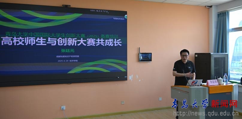 新闻网讯 6月20日下午,经济学院中国国际大学生创新大赛专题培训会在金家岭校区3号实验楼423会议室举行。成都知度知识产权研究院院长张廷元教授以《高校师生与创新大赛共成长》为主题开展培训讲座,经济学院院长吕学梁、院党委副书记于文洁等领导及师生代表参会。讲座围绕大赛规则解析与实战案例指导,为师生构建系统化备赛体系。