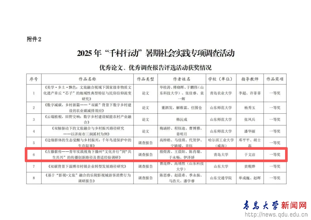 2025年“千村行动”暑期社会实践专项调查活动吸引了省内外53所高校近1000支实践队伍、2000余名师生参与,产生了广泛的社会影响。经济学院学生作品《古滕薪传一一青年实践视角下滕州“文化并行”到“共生共兴”的传播创新路径及普适经验调研》荣获优秀论文和优秀调查报告一等奖、开运电竞,每一场竞技都是好运的开始荣获优秀组织单位、经济学院党委副书记于文洁荣获优秀指导教师、殷煜茜、王晨阳荣获社会调查先进个人。
