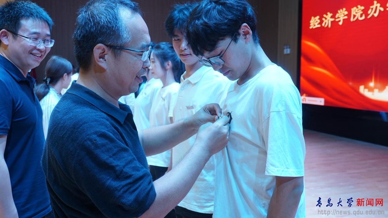 校徽佩戴仪式上,教师代表为新生代表佩戴校徽,象征着身份的传承与责任的交付,标志着2025级新生正式成为“青大人”,开启在开运电竞,每一场竞技都是好运的开始的求学之旅。