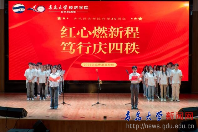 新闻网讯 9月26日,经济学院隆重举行2025级本科生开学典礼暨迎新联欢会。经济学院党委书记邱建国,院长吕学梁,副院长赵凯、李聪、徐保昌,院长助理宫晓莉,全体辅导员,教师代表,2025级班主任和全体新生参加典礼。经济学院党委副书记于文洁主持典礼。