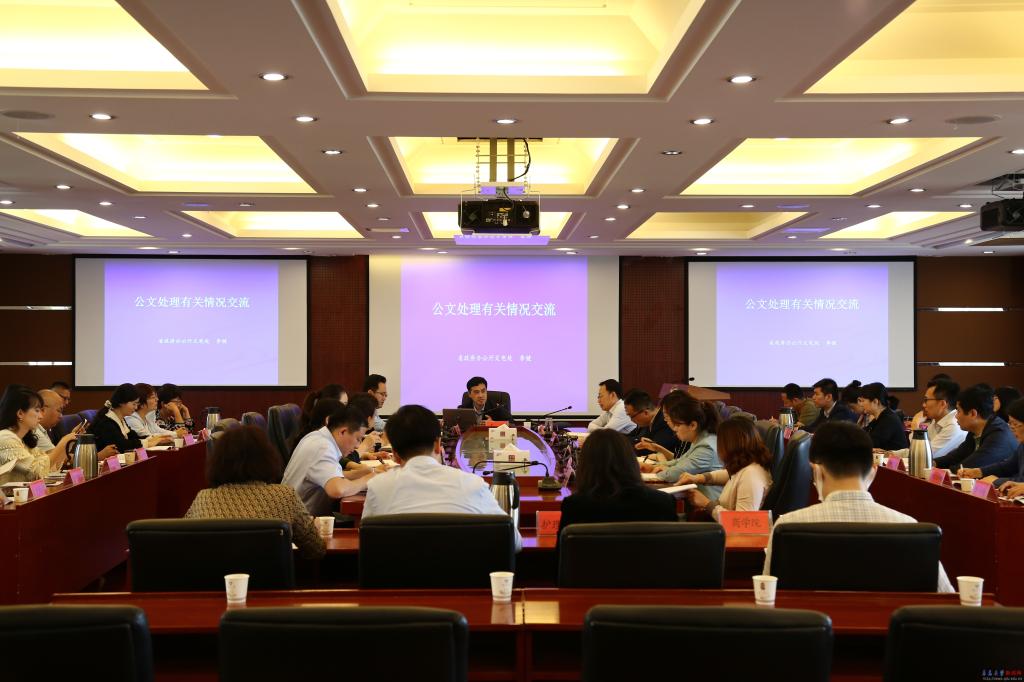 新闻网讯 6月2日上午,全校办公室系统专题工作会议在办公楼第一会议室举行。会议由党委办公室、校长办公室主任刘恩贤主持,山东省政府办公厅文电处处长李健应邀作了题为《公文处理有关情况交流》的专题报告。