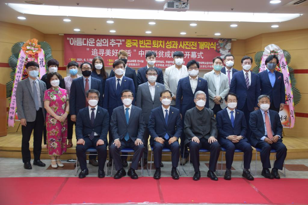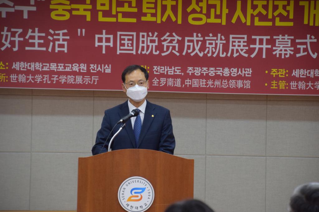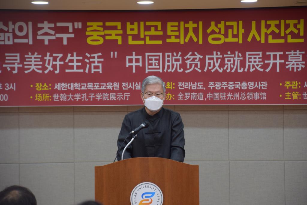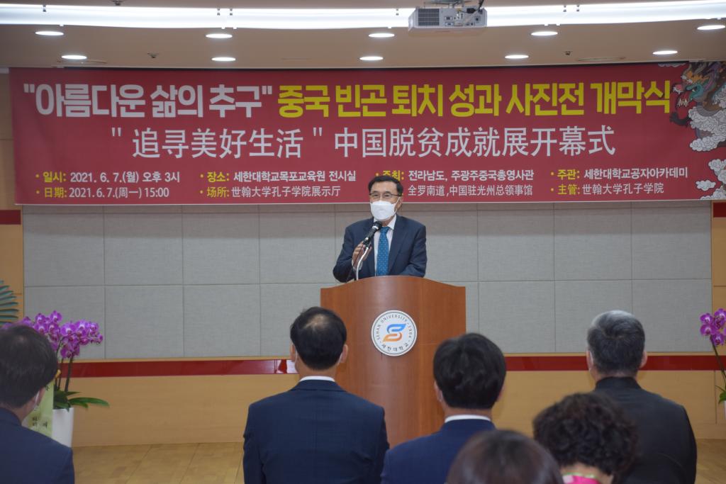 新闻网讯 6月7日,在韩国世翰大学孔子学院举行“追寻美好生活”中国脱贫成就展开幕式。本次脱贫成就照片展由中国驻光州总领事馆、全罗南道道厅共同主办,由世翰大学孔子学院承办。张承刚总领事、全罗南道政务副知事宋庠烙、木浦市长金钟植、世翰大学总长李昇勋等全南地区政府机关和文化界、教育界、新闻媒体、华侨代表,留学生代表以及友好团体代表等50多位人士出席。