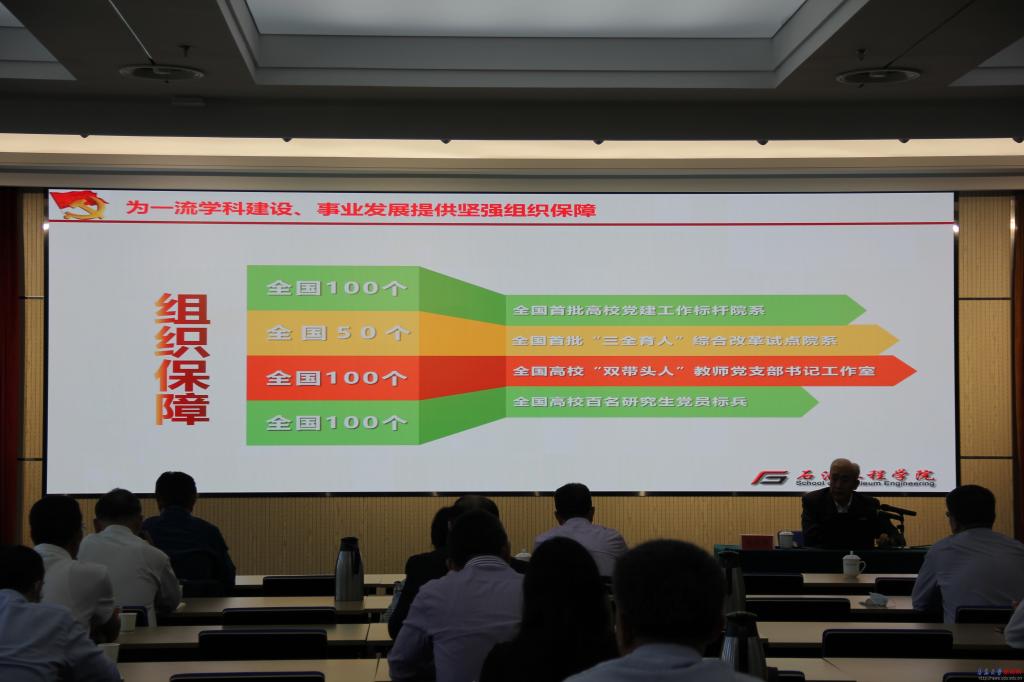 中国石油大学(华东)地球科学与技术学院党委书记赵放辉以《以一流党建引领一流学科建设》为题,从全国首批高校党建工作标杆院系建设入手,介绍了石油工程学院党建双创工作和取得的成果,分享了做好院系党组织书记的工作经验。赵放辉详细介绍了“一三三五”党建“双创”建设思路,“一个共建”即坚持全国党建工作标杆院系与全国首批“三全育人”综合改革试点院(系)共建;“三个结合”即坚持软件建设和硬件建设相结合、统筹规划和分步实施相结合、整体提升和品牌塑造相结合;“三项工程”即实施党政共同负责制的机制工程、“清单工作法”抓基层党建工程和“三项标杆工程”;“五个到位”实现党组织领导和运行机制到位、政治把关作用到位、思想政治工作到位、基层组织制度执行到位、推动改革发展到位。