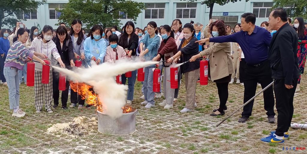 在灭火实训环节,安全管理处工作人员现场演示灭火器的具体使用,学生在老师指导下进行灭火器使用操练。