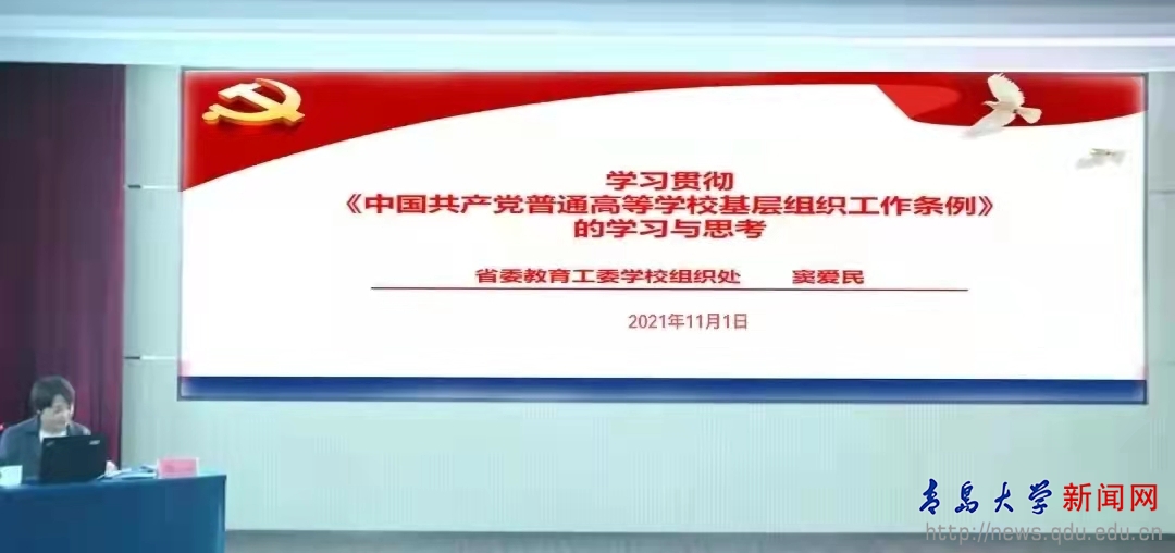 省委教育工委学校组织处二级调研员窦爱民以《学习贯彻<中国共产党普通高等学校基层组织工作条例>的学习与思考》为题,对《条例》十章三十九条逐条进行了深入细致的解读,并结合工作中具体案例进行了分析答疑。