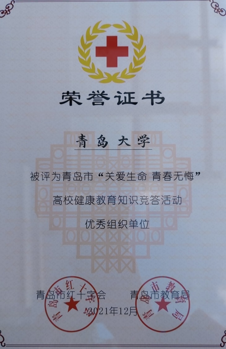 新闻网讯 12月17日,青岛红十字会与青岛市教育局组织召开青岛市“关爱生命、青春无悔”知识竞答抽奖暨高校红十字工作座谈会。我校获评青岛市“关爱生命青春无悔”高校健康教育知识竞答活动优秀组织单位。