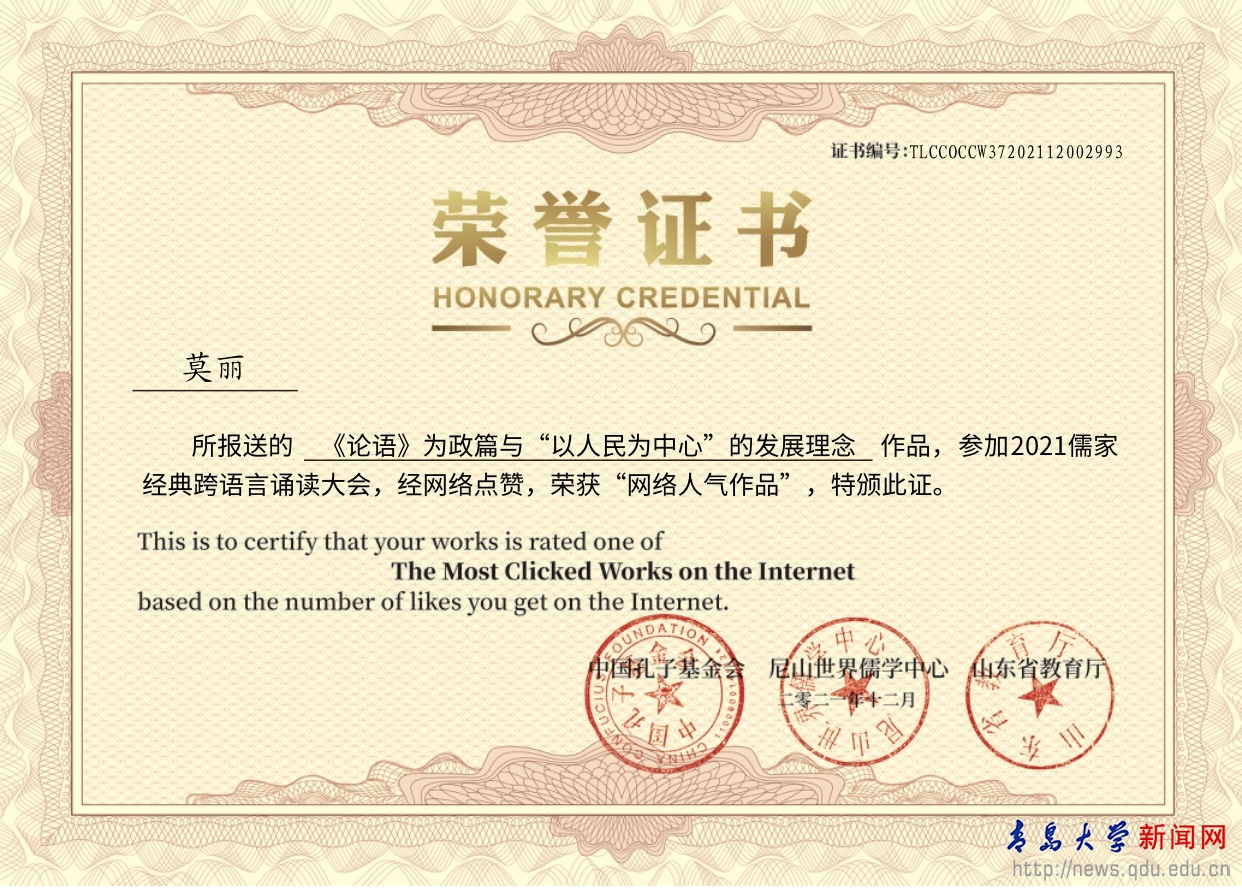 新闻网讯 近日,“2021儒家经典跨语言诵读大会年度盛典”在济南举行。经专家三轮品鉴及网络点赞,我校墨西哥留学生曾贤和赤道几内亚留学生覃月荣获“2021儒家经典跨语言诵读大会”儒家经典传诵人称号,我校韩国留学生金世友的作品《论语》中韩双语朗诵及阐释获得大会入围奖,由国际教育学院张淑慧副教授指导的乌兹别克斯坦留学生莫丽的作品《论语》为政篇与“以人民为中心”的发展理念获得入围奖及“网络人气作品”奖。