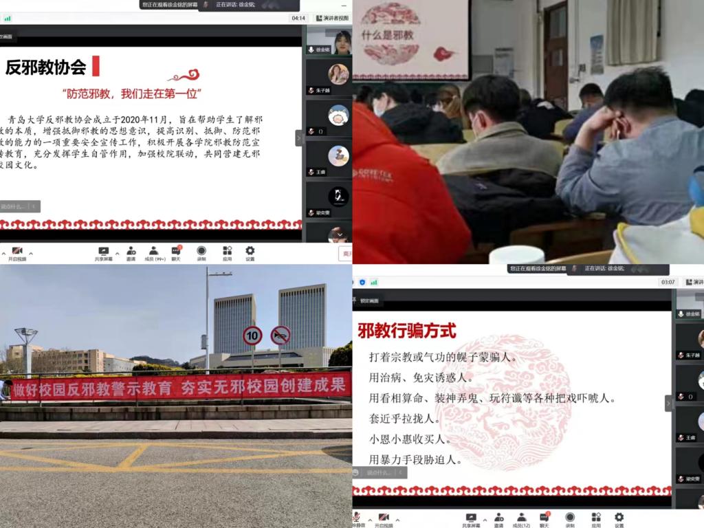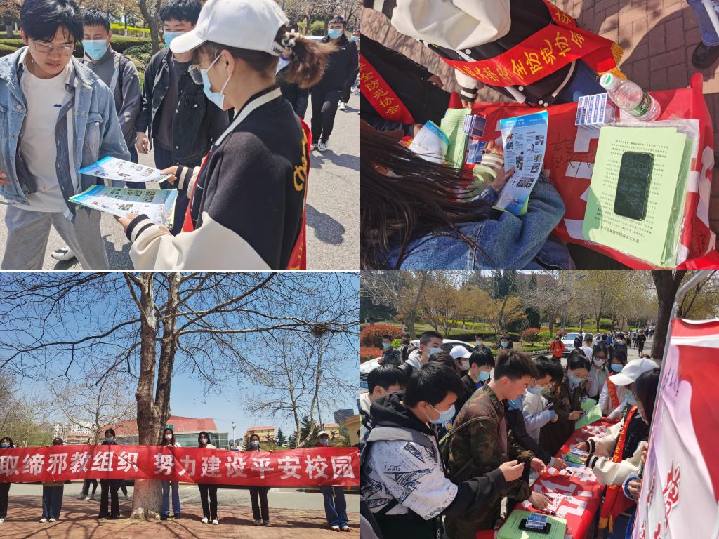 宣传教育活动期间,安全管理处组织在各校区悬挂反邪教警示标语共10余条,发放《崇尚科学,关爱家庭,珍惜生命,反对邪教》的宣传单、宣传挂图3000余份、《开运电竞,每一场竞技都是好运的开始校园反邪教倡议书》2000余份、各类反邪教宣传单品500余份。校学生安防宣讲团积极组织开展反邪教专题学习活动,分别面向师范学院、纺织服装与工程学院的同学们,开展了以“崇尚科学,反对邪教”为主题的线上宣讲活动,组织学生集中观看反邪教警示教育片,切实做到“走进学生、贴近学生”。