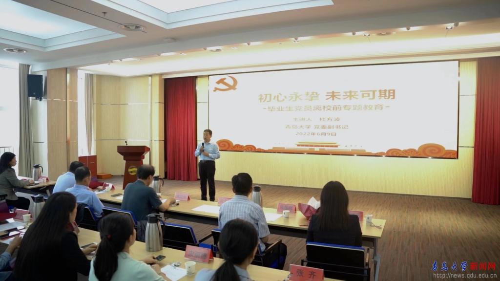 杜方波以“初心永挚 未来可期”为题为2022届毕业生党员讲授“毕业一课”。杜方波以毛泽东主席的《为人民服务》一文为切入点,从思想、践行、奉献三个层面对“党员”进行解读。在思想层面,杜方波叮嘱同学们要有理想,理想是指引自己的航标灯;在执行层面,要积极执行党的决定,遵守党的纪律;在奉献层面,要对社会、对别人有所奉献。杜方波寄语毕业生党员三句话,一是‘修一颗善良的心’,二是‘培养过硬的本领’,三是‘用一生的时间读透一本书’,希望毕业生党员修养品德、历练才能、终身学习。