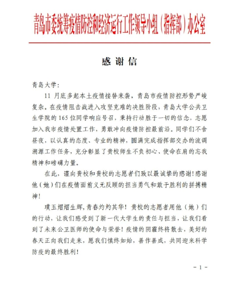 新闻网讯 近日,我校收到青岛市委统筹疫情防控和经济运行工作领导小组(指挥部)办公室、市北区疾病预防控制中心、即墨区疾病预防控制中心、西海岸新区疾病预防控制中心、胶州市新冠肺炎疫情常态化防控工作领导小组(指挥部)等单位发来的感谢信以及李沧区疾病预防控制中心、西海岸新区疾病预防控制中心等单位赠送的锦旗,向我校165位青年志愿者致以诚挚感谢。