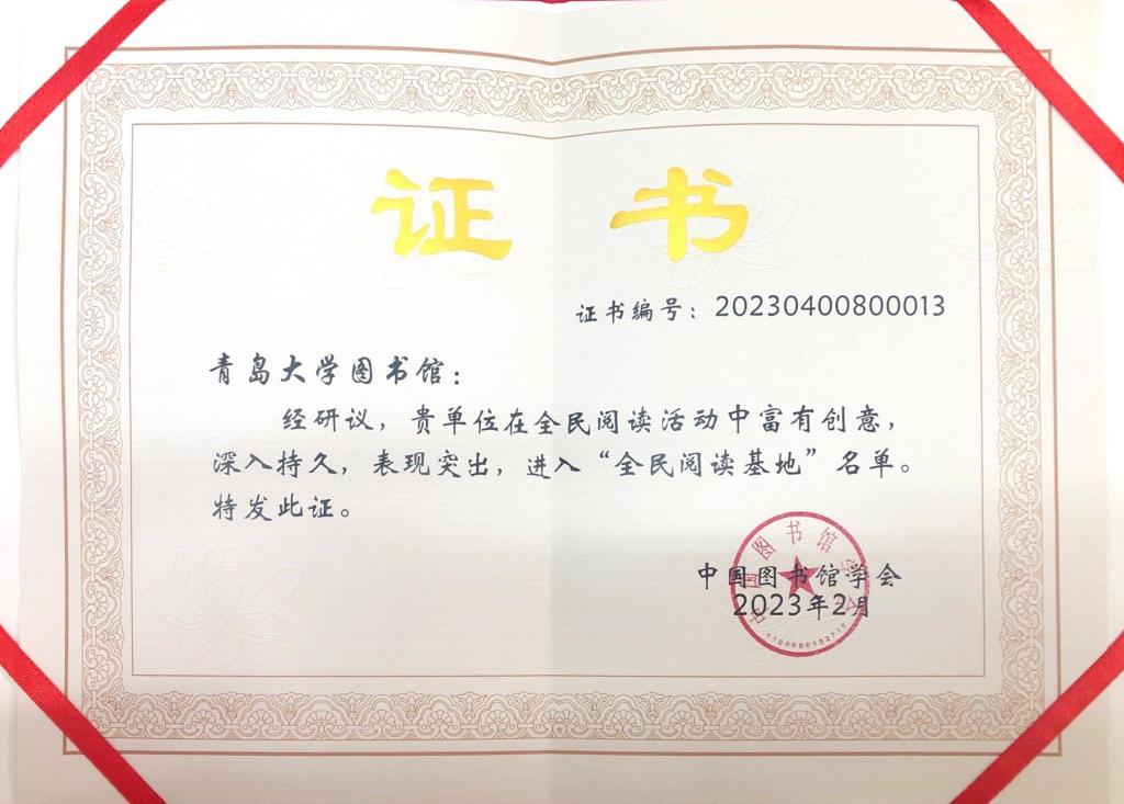 新闻网讯 近日,中国图书馆学会公布了2021年全民阅读工作有关名单,我校图书馆被授予“全民阅读基地”称号。全国仅有24家单位获此殊荣,我校图书馆是山东省唯一入选单位,也是全国入选的三所本科高校图书馆之一。