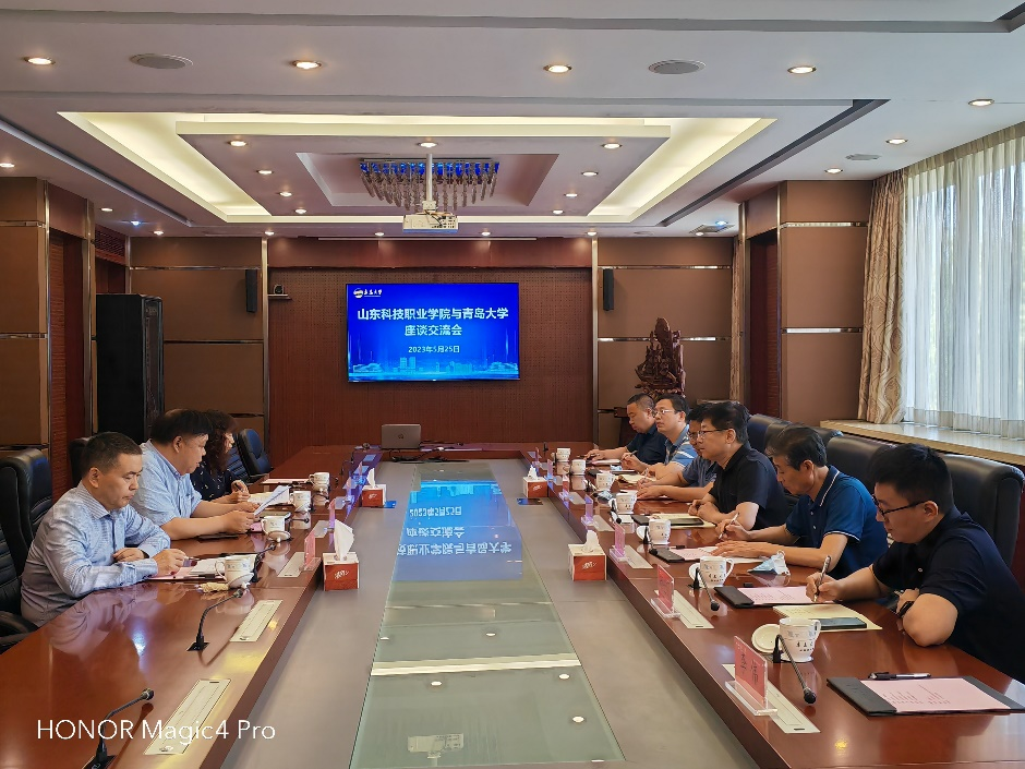 新闻网讯 5月25日上午,山东科技职业学院党委委员、副院长李保城一行到访我校。我校副校长李荣贵在201会议室会见并座谈,审计处处长赛金英、产业技术研究院执行院长崔言民陪同座谈。