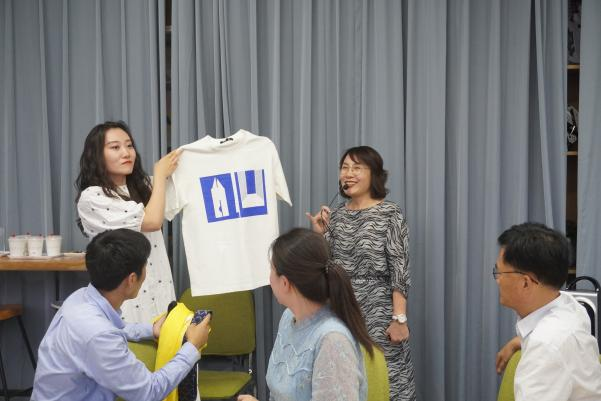 纺织服装学院教师初晓玲分享了指导学生创业的体验,与创业团队提前设计、搭建起作品展示区域,青大元素、创客标识、原创学位服、文创周边等,吸引大家纷纷驻足观看、合影留念。