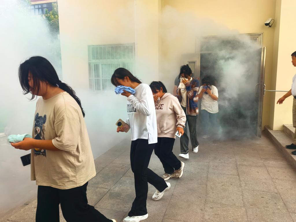 在消防知识培训环节,培训老师强调了宿舍消防安全的重要性,详细讲解了灭火器的类型和使用方法,介绍了疏散演练的注意事项。在疏散逃生环节,随着警笛声响起,工作人员在公寓楼指定位置拉开消防演练专用烟雾弹,模拟火场环境。参加演练的学生们按照演练方案预先设定的疏散路线和规定要求,用湿毛巾捂住口鼻,以低姿快速、有序地从各个安全出口进行疏散撤离,迅速到指定地点集中。在灭火实训环节,安全管理处的工作人员现场演示了灭火器的使用方法,随后参与演练的学生在老师的指导下进行现场操练。