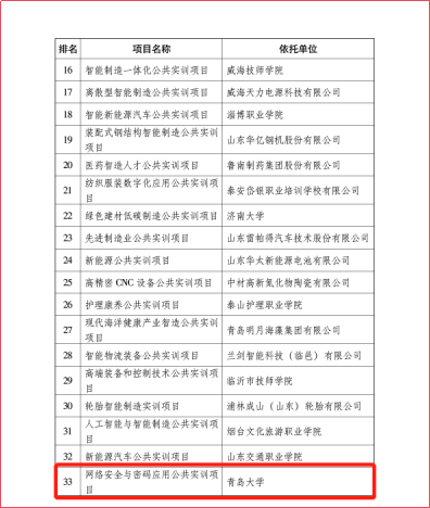 根据《山东省新旧动能转换公共实训项目建设及奖补资金管理实施细则》,为加快培养创新型、实用型、技能型人才,打造高技能人才培养高地,加快推动全省经济高质量发展,省工业和信息化厅围绕“十强”产业和传统优势产业,聚焦十一条标志性产业链,组织开展了山东省新旧动能转换公共实训项目建设工作。经过推荐申报、专家评审、社会公示等程序,共确定3所本科高校、16所高职和职业学校、31家企业建设的公共实训项目为山东省新旧都能转化公共实训项目。我校计算机科学与技术学院咸鹤群教授主持申报的网络安全与密码应用公共实训项目经过学校申报、省教育厅评选推荐,在省工业和信息化厅组织的最终评选中胜出。