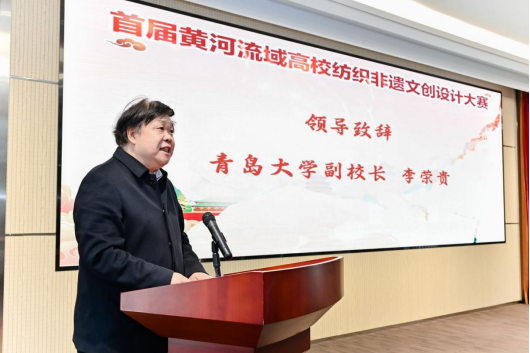 李荣贵在讲话中表示,此次纺织非遗文创设计大赛,是践行习近平总书记在黄河流域生态保护和高质量发展座谈会上重要讲话精神的有效举措,大赛弘扬黄河流域纺织文化,用纺织非遗讲好“黄河故事”,必将增强同学们对于黄河文化的认识、激发黄河文化创新创造活力。