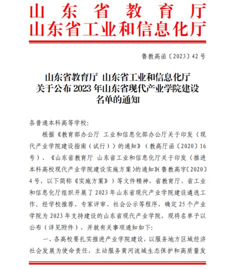 新闻网讯 近日,山东省教育厅、山东省工业和信息化厅公布了2023年度山东省现代产业学院建设名单,学校申报的“集成电路产业学院”获批立项,这是我校继海信人工智能学院、现代纺织产业学院之后,获批的第三个省级现代产业学院。
