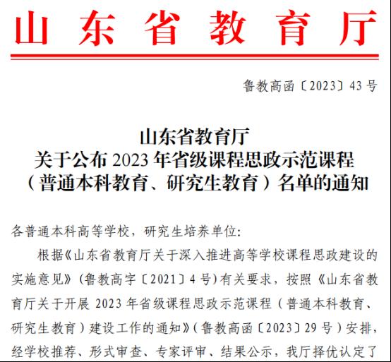 新闻网讯 近日,山东省教育厅公布了2023年省级课程思政示范课程名单,我校9门课程获批立项,其中普通本科教育课程8门、研究生教育课程1门。
